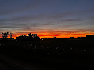 Vaikka omalta tontilta ei nyt suoranaisesti auringonlaskun viime metrit näy, niin sopivaan aikaan kun tehdään iltapisulenkki niin pääsee näkemään kyllä mahtavia auringonlaskuja näkee tuossa yhden pellon laidalla.